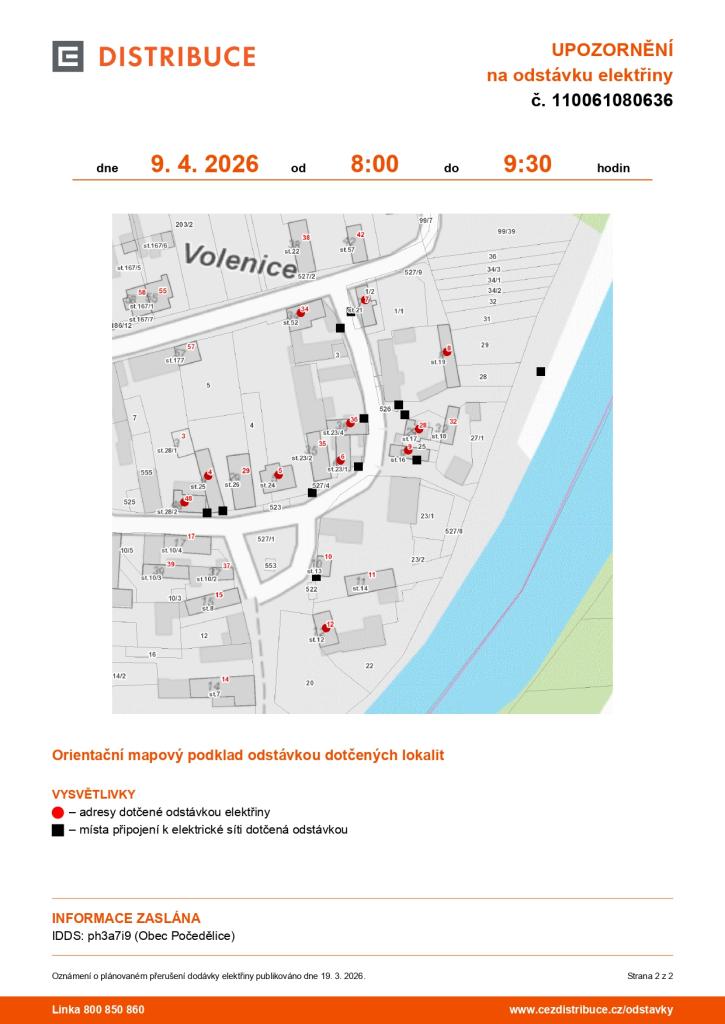Oznamujeme plánovanou odstávku elektřiny ve Volenice dne 9. dubna 2026 od 8:00 do 9:30 hodin. Dotčeny budou adresy č.p. 4-9, 12, 28, 34, 36 a 48. Je nutné mít na paměti, že i v době odstávky je třeba považovat všechna zařízení za pod napětím a dbát na bezpečnostní opatření.