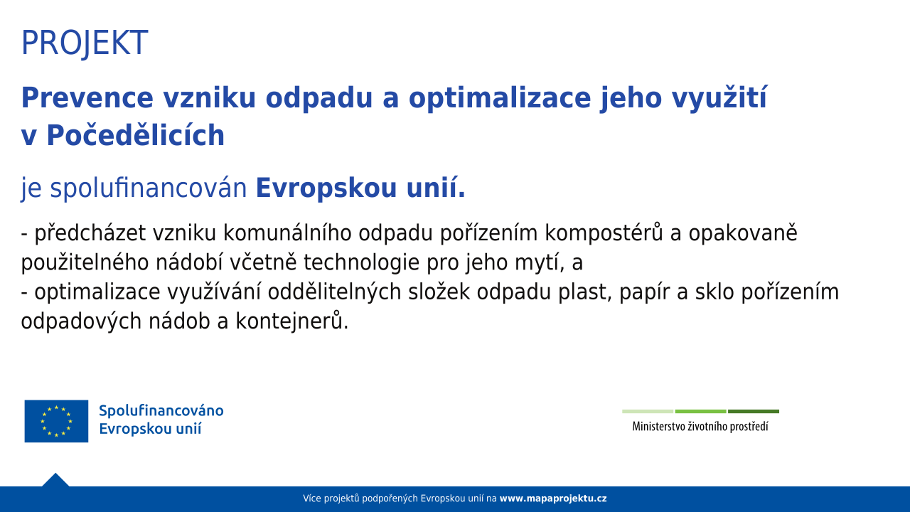 V obci Počedělice byl zahájen projekt zaměřený na prevenci vzniku odpadu a optimalizaci jeho využití. Tento projekt je spolufinancován Evropskou unií a Ministerstvem životního prostředí. Cílem je pořídit kompostéry a opakovaně použitelné nádobí včetně technologie pro jejich mytí, což přispěje k předcházení vzniku komunálního odpadu. Dále dojde k optimalizaci využívání oddělitelných složek odpadu, jako jsou plast, papír a sklo, formou pořízení nových odpadových nádob a kontejnerů. Pro více informací o dalších projektech podpořených Evropskou unií navštivte www.mapaprojektu.cz.